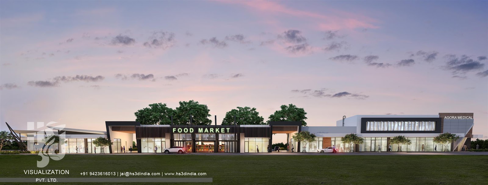 SNAZZY DUSK ELEVATION 3D DESIGNS & RENDERING OF FOOD MARKET BY HS3D INDIA